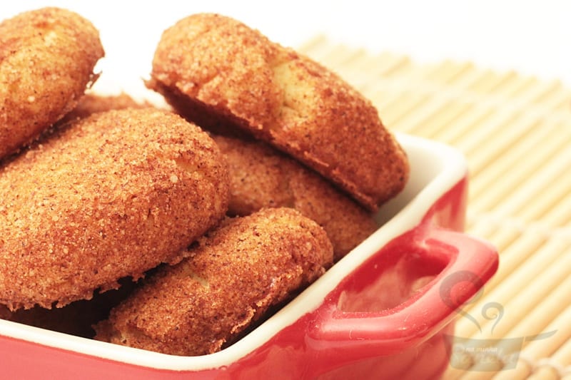 Passe os biscoitinhos na mistura de açúcar e canela, cobrindo-os totalmente, inclusive nas laterais. Organize seus biscoitinhos em uma assadeira coberta com papel manteiga. Leve ao forno em temperatura média por aproximadamente 30 minutos, ou até que estejam firmes. Deixe esfriar antes de servir para seus biscoitos ficarem bem crocantes.