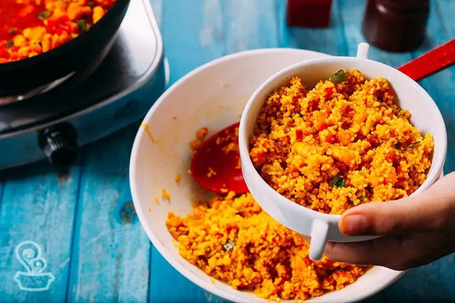 - Comece hidratando o couscous misturando-o ao caldo de legumes quente e deixando descansar por aproximadamente 15min ou até que os grãos estejam macios.
